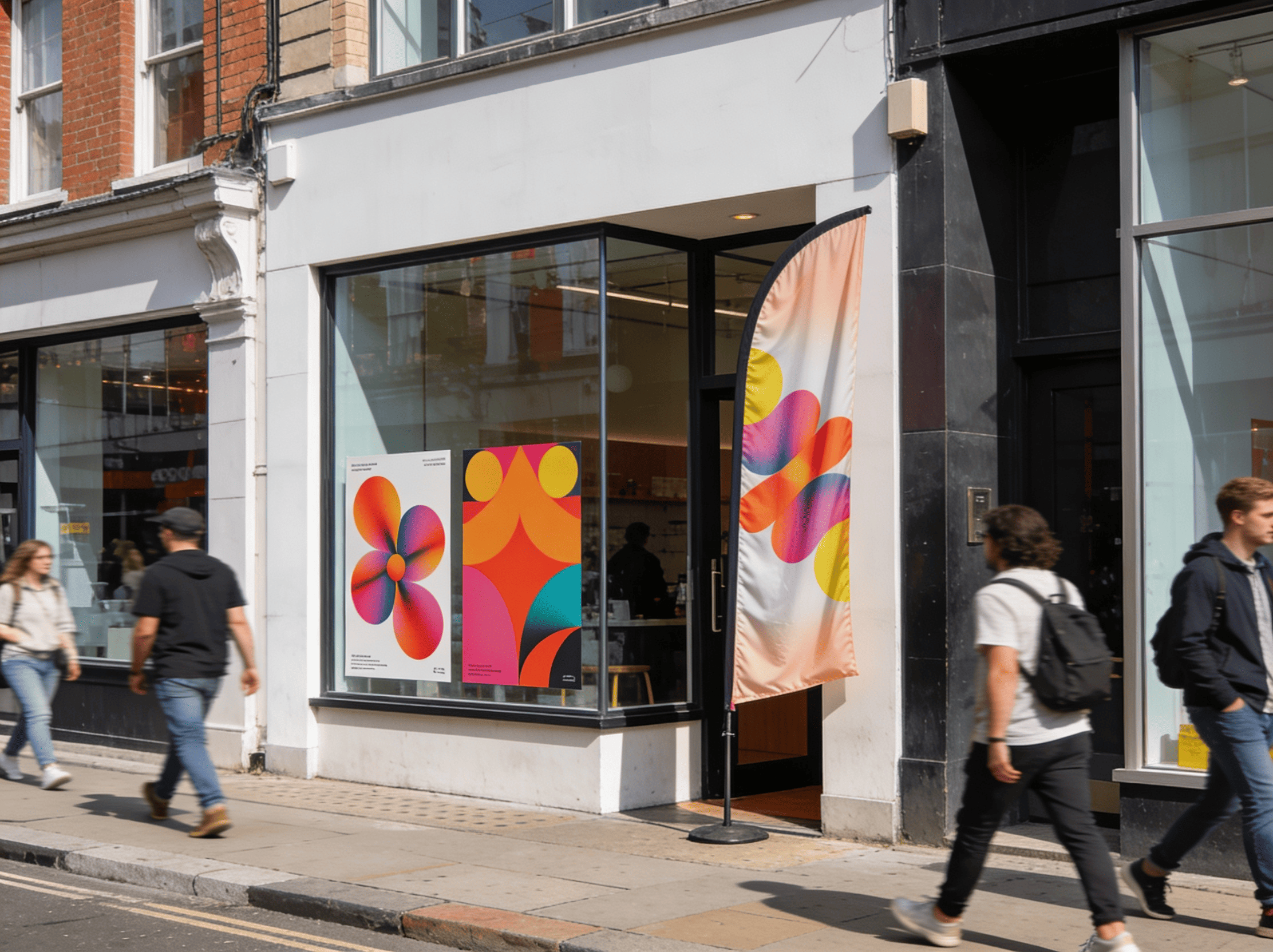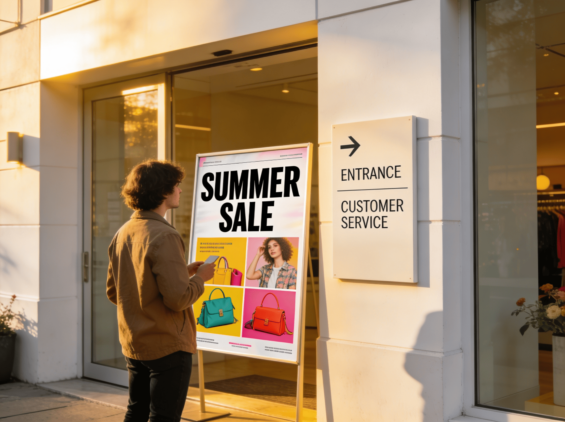 Первая задача печатной рекламы — быстро остановить взгляд. Для этого используют баннеры, плакаты, постеры, вывески, наклейки на витринах и другие заметные носители. Они особенно полезны там, где человек принимает решение на месте: проходит мимо магазина, выбирает кафе, заходит в торговый центр, подходит к стенду на выставке или видит промозону.